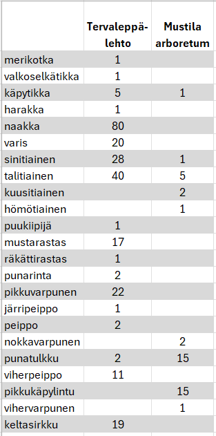 Elimäen Arboretum Mustilan ruokintapaikalla oli tavallista hiljaisempaa, syyksi epäiltiin esimerkiksi varpushaukkaa tai -pöllöä. Syyllistä ei nähty, mutta mielenkiintoisia havaintoja tehtiin silti. Mainittakoon ruokinnan yllä pyörähtänyt käpylintuparvi ja vaahteroiden latvoissa pitkään viihtyneet nokkavarpuset - muutamille osallistujille elämän ensimmäiset.