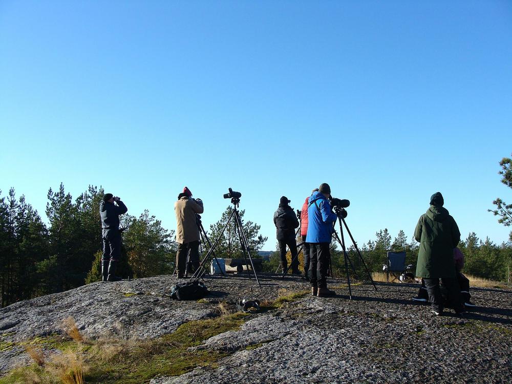 Lauantaina 18.10. kello 10-14 järjestettiin opastettua muutontarkkailua Virolahden Lakakalliolla. Pääosissa olisi petolintumuutto ja ajankohdan tyyppilajit maakotka ja piekana. Tällaisen tapahtuman järjestäminen on aina haastavaa, sillä sääennusteita ei voi tietää alkusyksyllä, kun ajankohta täytyy lyödä lukkoon. Koko viikonlopulle saatiin lopulta ihan mahtava keli (kylmää, kirkasta ja vieno pohjoistuuli), joka loi hyvät odotukset tapahtuman onnistumiselle. Vielä kun edellisenä päivänä oli Porvoossa havaittu yhdeltä paikalta käsin 14 muuttavaa nuorta maakotkaa, niin ainakin opas innostui hehkuttamaan tätä tietoa tapahtuman ensi tunteina kaikille osallistujille erikseen. Nuoret maakotkat ovat lähteneet liikkeelle juuri oikeana hetkenä.